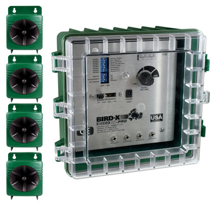 Отпугиватель птиц BroadBand PRO оснащён четырьмя выносными динамиками, которые можно установить в местах отдыха и гнездования, но на высоте не менее 6 м от точек, где находятся люди. Устройство не надо обслуживать, оно действует автоматически. В случае необходимости возможна перенастройка. Управление происходит с передней панели.